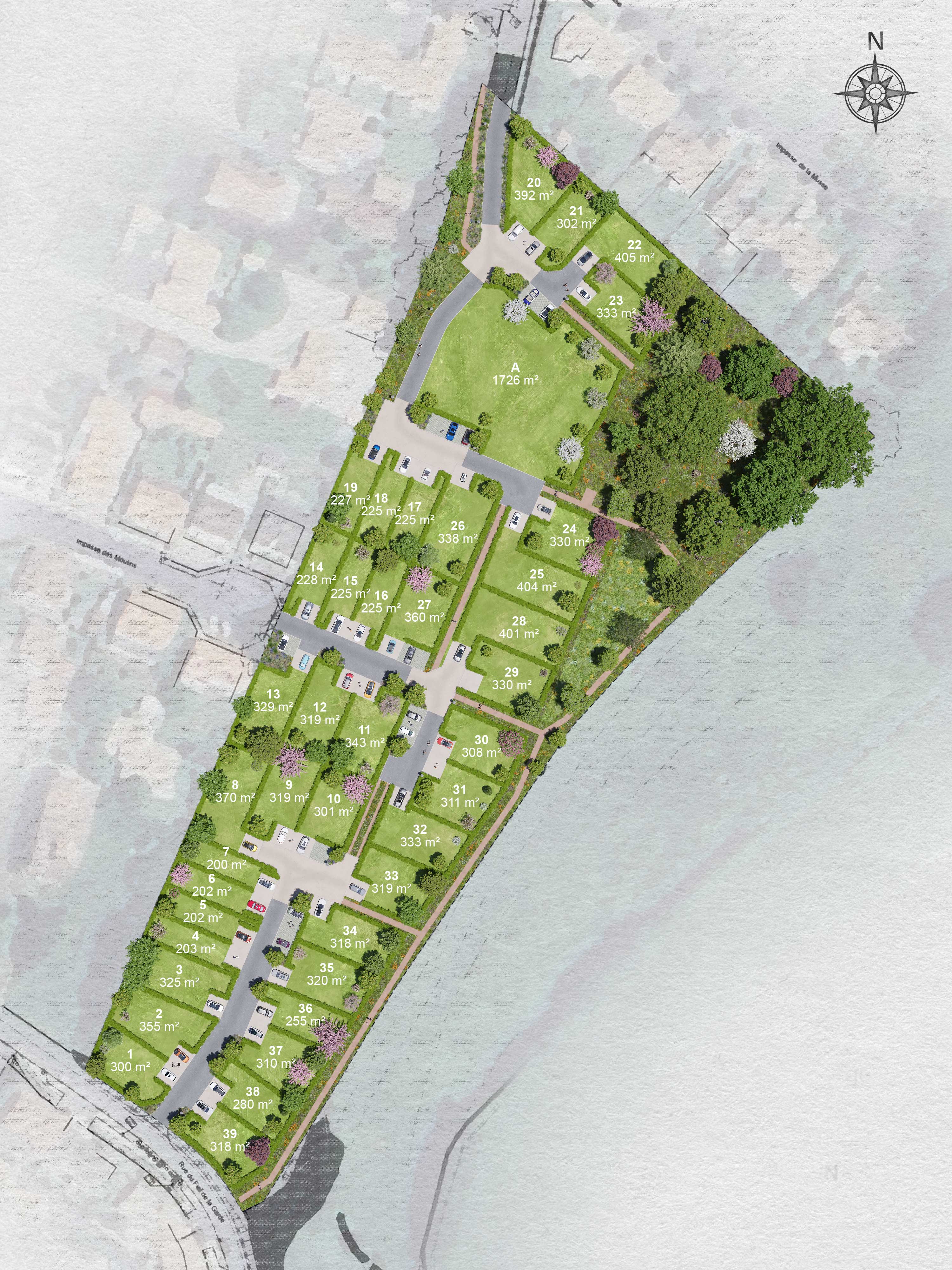 Le lotissement Le Hameau du Verger propose 39 terrains viabilisés en plein cœur de ville, libres de constructeur, aux surfaces comprises entre 200 m² et 405 m².